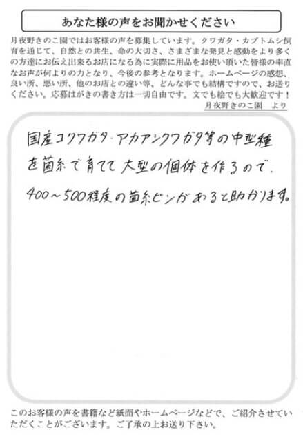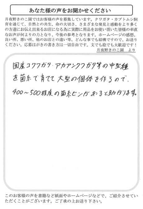 北海道 吉村 様 取扱追加希望 X Facebook はてブ LINE Pinterest コピー 2023.10.242025.12.15 国産コクワガタ・アカアシクワガタ等の中型種を菌糸で育てて大型の個体を作るので、400~500程度の菌糸ビンがあると助かります。