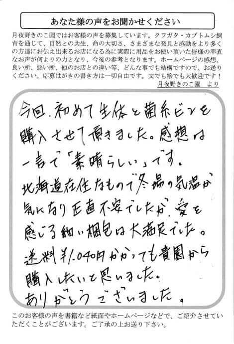 北海道 天野 様 梱包 X Facebook はてブ LINE Pinterest コピー 2016.01.19 今回、初めて生体と菌糸ビンを 購入させて頂きました。感想は 一言で「素晴らしい」です。 北海道在住なので冬場の気温が 気になり正直不安でしたが、愛を 感じる細い梱包は大満足でした。 送料¥1,040円かかっても貴園から 購入したいと思いました。 ありがとうございました。