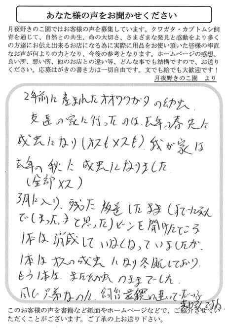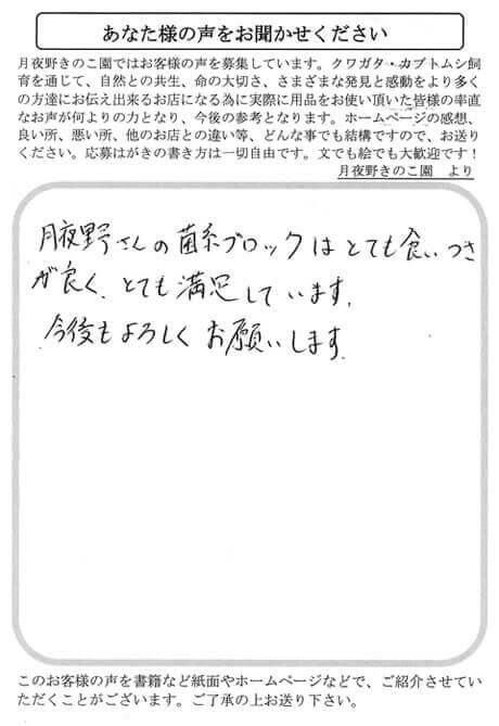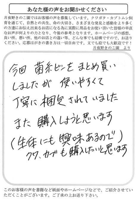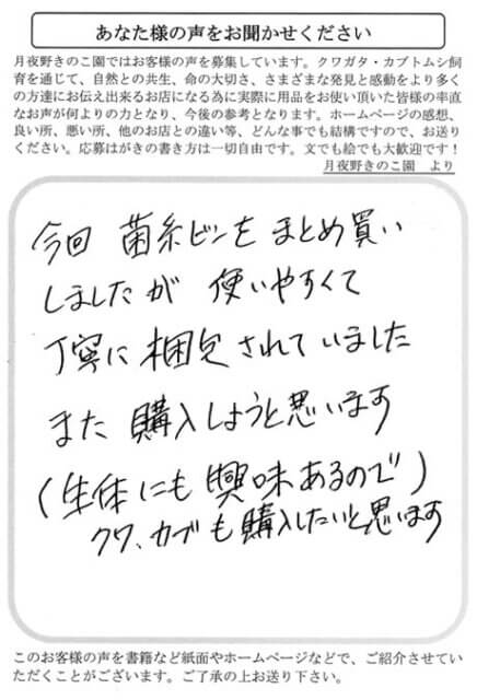 北海道 河端 様 菌糸ビン X Facebook はてブ LINE Pinterest コピー 2023.03.252025.12.16 今回、菌糸ビンをまとめ買いしましたが使いやすくて、丁寧に梱包されていました。また購入しようと思います。クワカブも購入したいと思います。