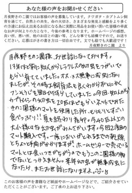 13年ほど前に知人からヘラクレスの幼虫をつがいでもらい育てていました。オス・メス無事に成虫になりましたが、その時は飼育法もよくわからずとにかくフンそうじを毎日ひたすらしていました。今回、知人からカブトムシの幼虫を20匹ほどもらいネットでみた、きのこ園のマットを使用した所、モリモリとすごい食べっぷり!!夏も終わり産卵・今40匹以上の大小様々な幼虫がわんさかいます。今回2度目のマット購入です。一度においがとれるまでの乾燥とちょっと手間がかかりますが、ホームセンターで売っているマットとは食いつきがちがうのでもうきのこ園の物でないとつかえません。来年幼虫が無事成虫になったら、またお世話になりますネ。
