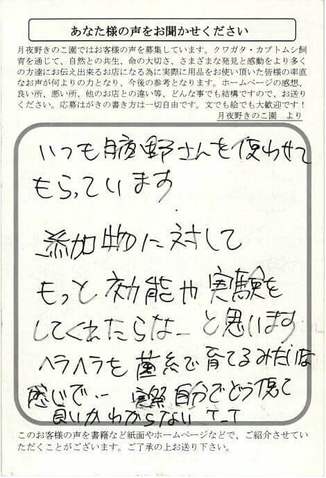 北海道 飯山 様 添加剤 X Facebook はてブ LINE Pinterest コピー 2011.03.23 いつも月夜野さんを使わせてもらっています。 添加物に対してもっと効能や実験を してくれたらなーと思います。 ヘラヘラを菌糸で育てるみたいな感じで、 実際自分でどう使って良いかわからない T_T