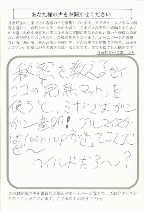 千葉県 二宮 様 きのこMat X Facebook はてブ LINE Pinterest コピー 2012.07.30 秘密を教えるゼイ ココの「完熟マット」を ミヤマは、ガンガン産卵! ブルマイスターは100ミリUPが 出るんだぜ~ ワイルドだろ~?