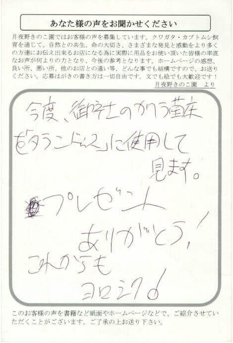 今度、御社のカワラ菌床を「タランドゥス」に使用して見ます。 プレゼントありがとう! これからもヨロシク!