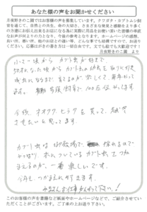 いつも御社製品を使わせて頂いております。添加に敏感な種や、粗いオガが得意でないWF1や種にも安定して使うことができ、またロット差が非常に少なくいつも同じ様に使用できるのが大変有難いです。また黒微マットも昨日開封しましたが香り、質感的にも難産卵種にも使えそうな印象です。昨年あたり?にリニューアルした完熟マットも粒度が程良く、細かくなったのあり、より使いやすくなったと感じています。これからも業界随一の品質安定性・サプライチェーン・開発力で業界を引っ張って頂きたいです。サポートに代えて購入させて頂きます。可能であればNシリーズにNPver(クリアボトル)が欲しく、また800ccがラインナップされると嬉しいです。