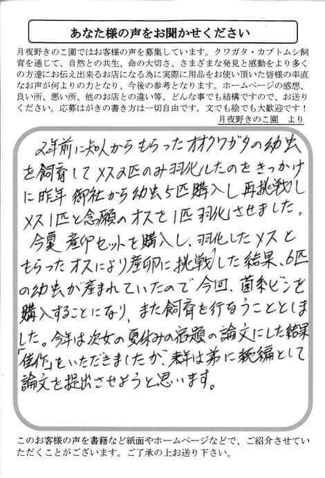 千葉県 岩瀬 様 生体 X Facebook はてブ LINE Pinterest コピー 2016.11.09 2年前に知人からもらったオオクワガタの幼虫 を飼育してメス2匹のみ羽化したのをきっかけ に昨年御社から幼虫5匹購入し再挑戦し メス1匹と念願のオスを1匹羽化させました。 今夏産卵セットを購入し、羽化したメスと もらったオスにより産卵に挑戦した結果、6匹 の幼虫が産まれていたので今回、菌糸ビンを 購入することになり、また飼育を行なうこととしま した。今年は次女の夏休みの宿題の論文にした結果 「佳作」をいただきましたが、来年は弟に続編として 論文を提出させようと思います。
