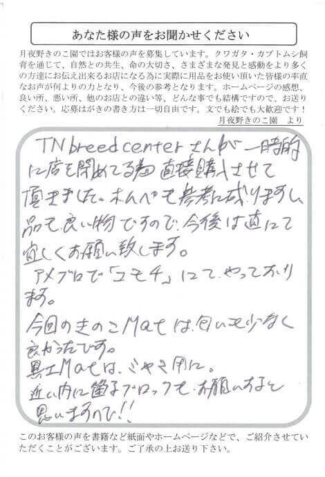 TN breed centerさんが一時的に店を閉めてる為直接購入させて頂きました。ホムペも参考に成りますし、品も良い物ですので、今後は直にて宜しくお願い致します。アメブロで「コモチ」にてやっております。今回のきのこMatは匂いも少なく良かったです。黒土Matは、ミヤマ用に。近い内に菌糸ブロックもお願いすると思いますので!!