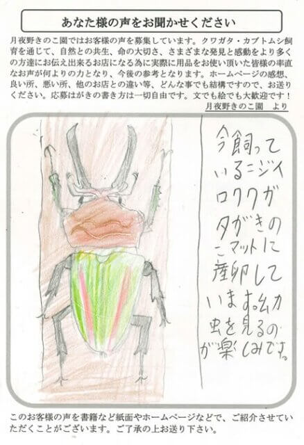 千葉県 平野 様 2025 12/16 イラスト 10代 2023年4月22日2025年12月16日 今飼っているニジイロクワガタがきのこマットに産卵しています。幼虫を見るのが楽しみです。 イラスト 10代 よかったらシェアしてね! URLをコピーしました! URLをコピーしました! 新潟県 原 様 奈良県 峯川 様 おすすめ記事 てすと投稿です。 2025年12月23日 東京都 澤井 様 2025年12月17日 千葉県 平野 様 2025年12月15日 群馬県 はやしかわ 様 2025年11月21日 群馬県 はやしかわ 様 2025年11月21日 奈良県 栗原 様 2025年11月21日 群馬県 鈴木 様 2025年11月21日 大阪府 ささべ 様 2025年11月21日