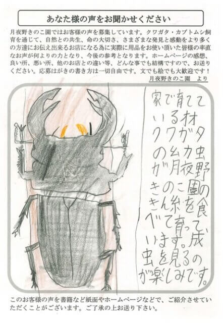 千葉県 平野 様 イラスト X Facebook はてブ LINE Pinterest コピー 2023.05.312025.12.15 家で育てているオオクワガタの幼虫が月夜野きのこ園のきん糸を食べて育っています。成虫を見るのが楽しみです。