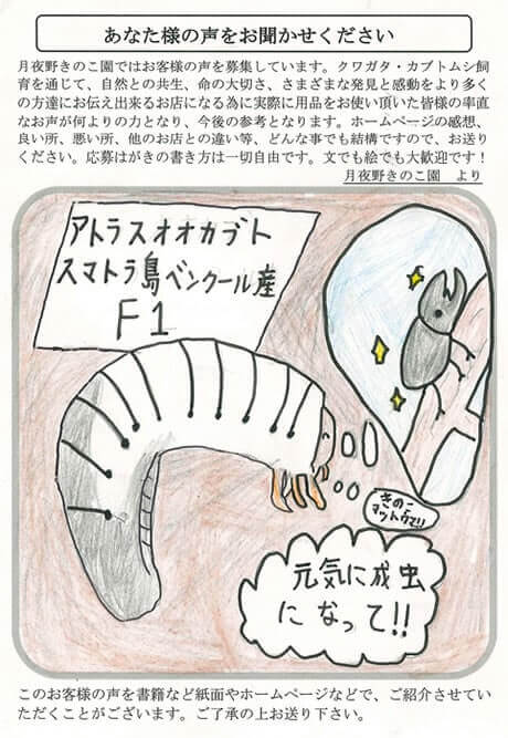千葉県 平野 様 イラスト X Facebook はてブ LINE Pinterest コピー 2023.11.152025.12.15 ヘラクレスが、きのこマットで卵を産んで、その幼虫が今、三令幼虫になっています。