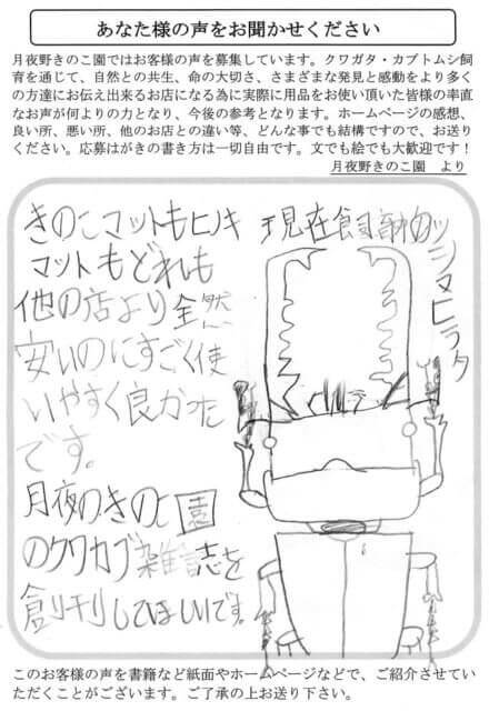 千葉県 田村 様 イラスト X Facebook はてブ LINE Pinterest コピー 2020.11.212025.12.17 きのこマットもヒノキマットもどれも他の店より全然安いのにすごく使いやすく良かったです。月夜野きのこ園のクワカブ雑誌を創刊してほしいです。