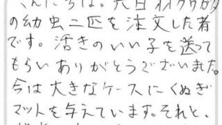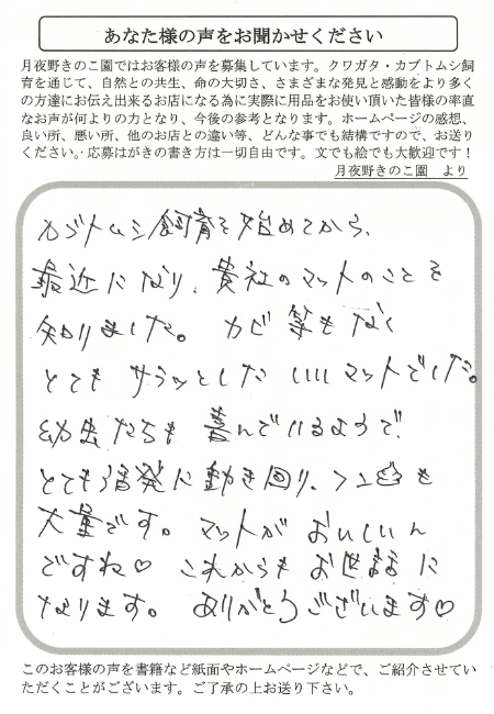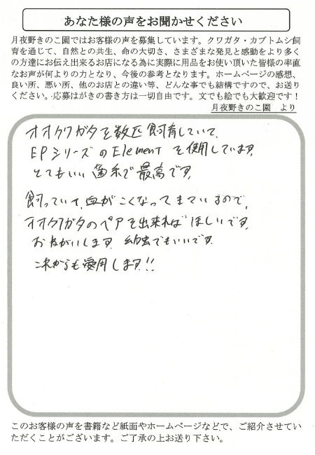 オオクワガタを数匹飼育していて、EPシリーズのElementを使用しています。とてもいい菌糸で最高です。飼っていて、血がこくなってきているので、オオクワガタのペアを出来ればほしいです。おねがいします。幼虫でもいいです。これからも愛用します!!