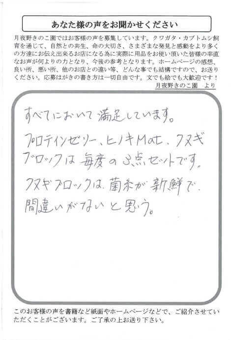 埼玉県 井澤 様 50代 X Facebook はてブ LINE Pinterest コピー 2017.11.22 すべてにおいて満足しています。プロテインゼリー、ヒノキMat、クヌギブロックは毎度の3点セットです。クヌギブロックは菌糸が新鮮で間違いがないと思う。