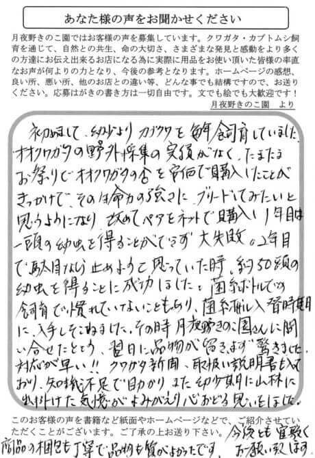 初めまして、幼少よりカブクワを毎年飼育していました。オオクワガタの野外採集の実績がなく、たまたまお祭りでオオクワガタの♂を安価で購入したことがきっかけで、その生命力の強さに、ブリードしてみたいと思うようになり、改めてペアをネットで購入し、1年目は1頭の幼虫を得ることができず、大失敗・・・・