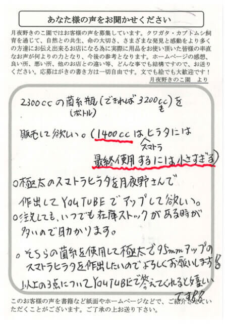 2300ccの菌糸瓶を販売して欲しい。極太のスマトラヒラタを月夜野さんで昨出してYouTubeでアップして欲しい。注文しても、いつでも在庫ストックがある時が多いので助かります。そちらの菌糸を使用して極太で95mmアップのスマトラヒラタを作出したいのでよろしくお願いします。