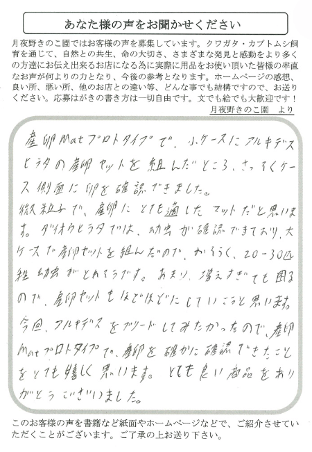 産卵Matプロトタイプで、小ケースにアルキデスヒラタの産卵セットを組んだところ、さっそくケース側面に卵を確認できました。微粒子で、産卵にとても適したマットだと思います。ダイオウヒラタでは、幼虫が確認できており、大ケースで産卵セットを組んだので、おそらく20~30匹程、幼虫がとれそうです。あまり増えすぎても困るので、産卵セットもほどほどにしていこうと思います。今回、アルキデスをブリードしてみたかったので、産卵Matプロトタイプで産卵を確かに確認できたことをとても嬉しく思います。とても良い商品をありがとうございました。