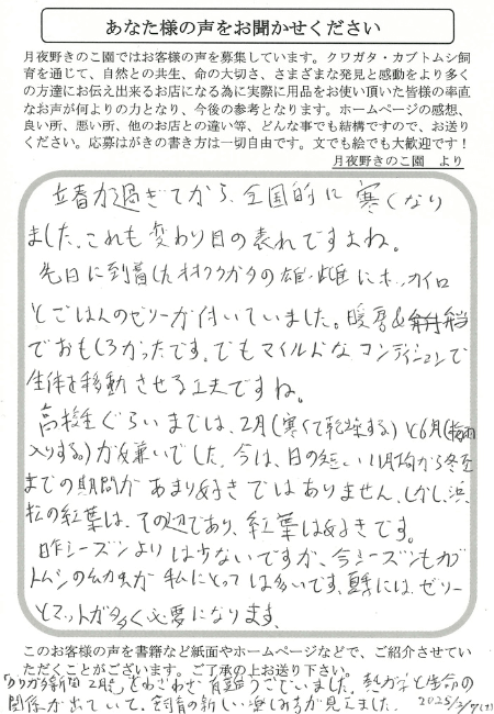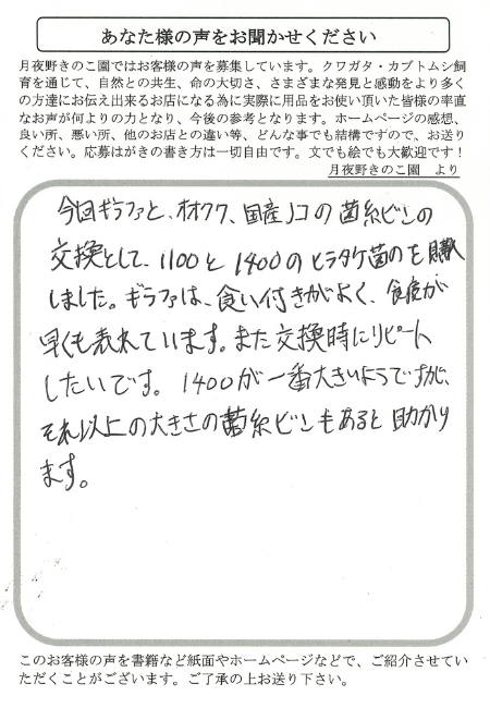 今回ギラファとオオクワ・国産ノコの菌糸ビンの交換として、1100と1400のヒラタケ菌のを購入しました。ギラファは食い付きがよく食痕が早くも表れています。また交換時にリピートしたいです。1400が一番大きいようですが、それ以上の大きさの菌糸ビンもあると助かります。