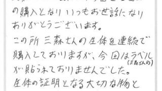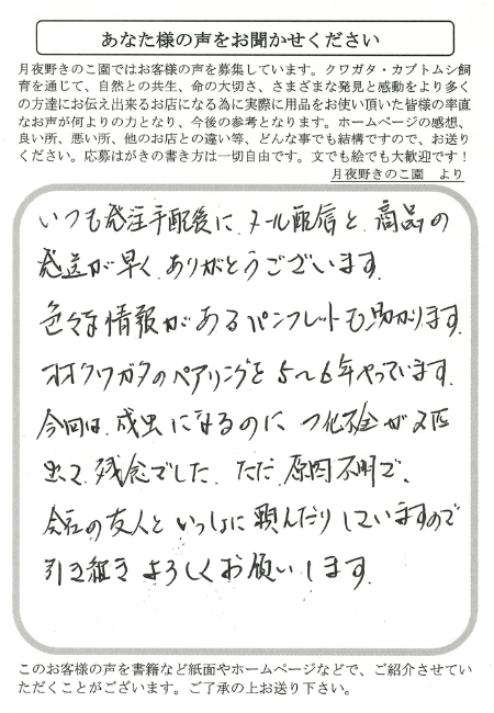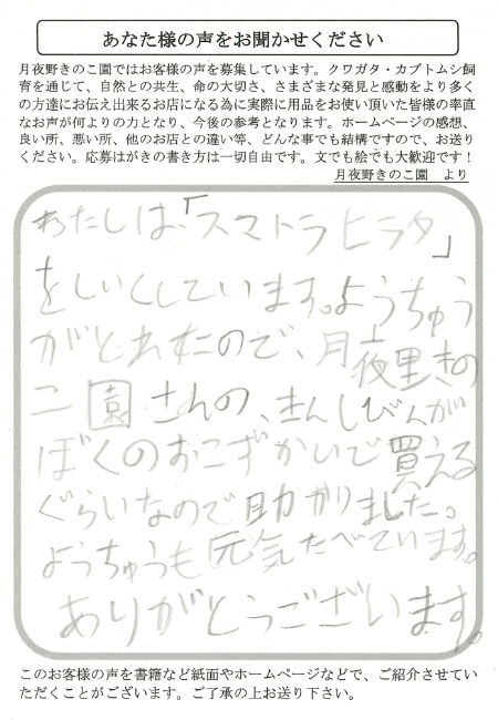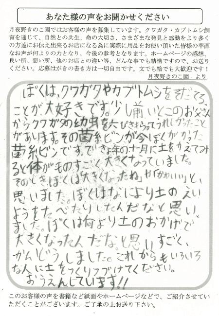 埼玉県 小原 様 菌糸ビン X Facebook はてブ LINE Pinterest コピー 2025.10.092025.12.15 わたしは「スマトラヒラタ」をしいくしています。ようちゅうがとれたので、月夜野きのこ園さんの、きんしびんがぼくのおこずかいで買えるぐらいなので助かりました。ようちゅうも元気たべています。ありがとうございます。