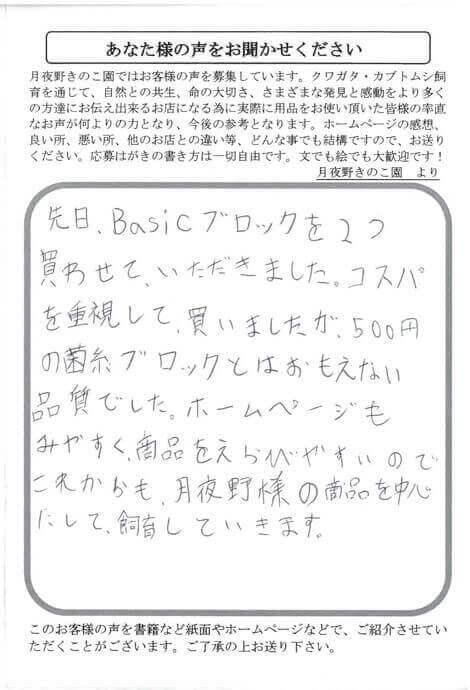 先日Basicブロックを2つ買わせていただきました。コスパを重視して買いましたが、500円の菌糸ブロックとはおもえない品質でした。ホームページもみやすく、商品を選びやすいので、これからも月夜野様の商品を中心にして飼育していきます。