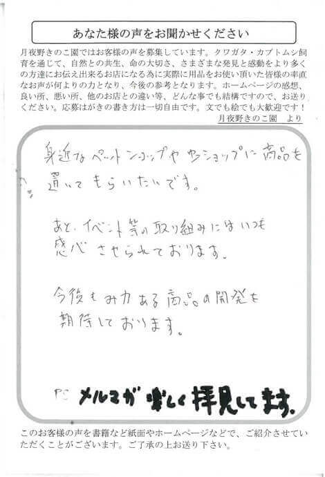 身近なペットショップや虫ショップに商品を置いてもらいたいです。あと、イベント等の取り組みにはいつも感心させられております。今後も魅力ある商品の開発を期待しております。PSメルマガ楽しく拝見してます。