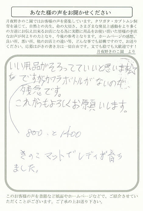 埼玉県 柳下 様 2012 1/31 取扱追加希望 10代 2012年1月31日 いい用品がそろってていいと思います☆ ですがカワラボトルがないのが残念です。 ↑ これからも宜しくお願いします。 800、と1400 きのこマットでレディが育ちました。 取扱追加希望 10代 よかったらシェアしてね! URLをコピーしました! URLをコピーしました! 愛知県 飯田 様 東京都 惣山 様 おすすめ記事 てすと投稿です。 2025年12月23日 東京都 澤井 様 2025年12月17日 千葉県 平野 様 2025年12月15日 群馬県 はやしかわ 様 2025年11月21日 群馬県 はやしかわ 様 2025年11月21日 奈良県 栗原 様 2025年11月21日 群馬県 鈴木 様 2025年11月21日 大阪府 ささべ 様 2025年11月21日
