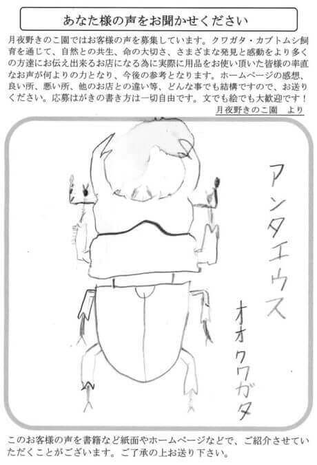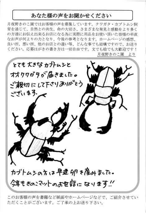 埼玉県 水野 様 イラスト X Facebook はてブ LINE Pinterest コピー 2016.08.08 とても大きなカブトムシと オオクワガタが届きました。 ご親切にして下さりありがとう ございます。 カブトムシの方は早速卵を産みました。 今年もきのこマットのお世話になります。