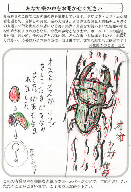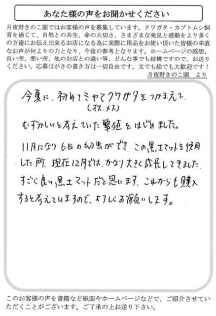 今夏に初めてミヤマクワガタをつかまえてむずかしいと考えていた繁殖をはじめました。11月になり6匹の幼虫ができ、この黒土マットを使用した所、現在12月では、かなり大きく成長してきました。すごく良い黒土マットだと思います。これからも購入すると考えていますので、よろしくお願いします。