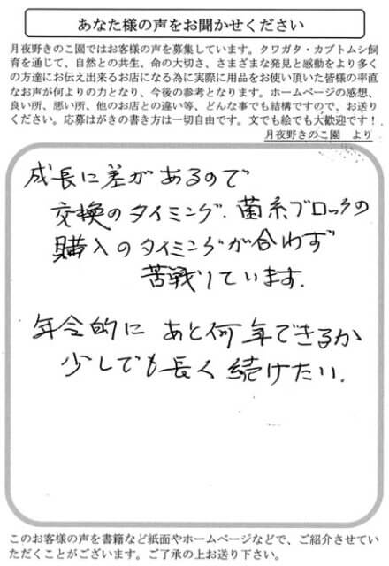 大分県 虎岡 様 飼育用品 X Facebook はてブ LINE Pinterest コピー 2022.10.272025.12.16 成長に差があるので交換のタイミング、菌糸ブロックの購入のタイミングが合わず苦戦しています。年令的にあと何年できるか少しでも長く続けたい。