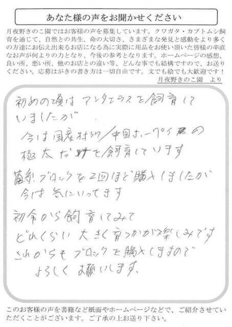 初めの頃はアンタエウスを飼育していましたが、今は国産オオクワ/中国ホーペイの極太だけを飼育しています。菌糸ブロックを2回ほど購入しましたが今は気にいってます。初令から飼育してみて、どれくらい大きく育つかが楽しみです。これからもブロックを購入しますのでよろしくお願いします。