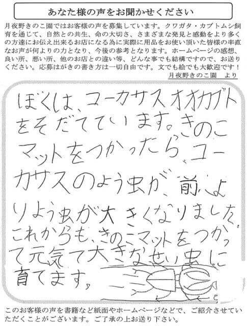 大阪府 吉村 様 きのこMat X Facebook はてブ LINE Pinterest コピー 2020.01.09 ぼくは、コーカサスオオカブトをそだてています。きのこマットをつかったらコーカサスのよう虫が、前よりよう虫が大きくなりました。これからも、きのこマットをつかって元気で大きなせい虫に育てます。