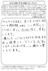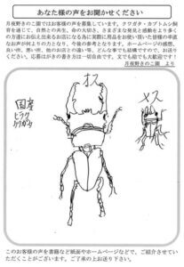 大阪府 平良 様 2025 12/16 ご意見・ご感想区分 60代 2022年11月5日2025年12月16日 パラワン・スマトラの常温での越冬のしかた教えて下さい。 ※回答 パラワンオオヒラタクワガタ・ダイオウヒラタクワガタですが越冬はできませんので寒い時期はできるだけ暖かめの場所で飼育していただくようオススメいたします。適温は23℃となります。 ご意見・ご感想区分 60代 よかったらシェアしてね! URLをコピーしました! URLをコピーしました! 愛媛県 清水 様 埼玉県 小田 様 おすすめ記事 てすと投稿です。 2025年12月23日 東京都 澤井 様 2025年12月17日 千葉県 平野 様 2025年12月15日 群馬県 はやしかわ 様 2025年11月21日 群馬県 はやしかわ 様 2025年11月21日 奈良県 栗原 様 2025年11月21日 群馬県 鈴木 様 2025年11月21日 大阪府 ささべ 様 2025年11月21日