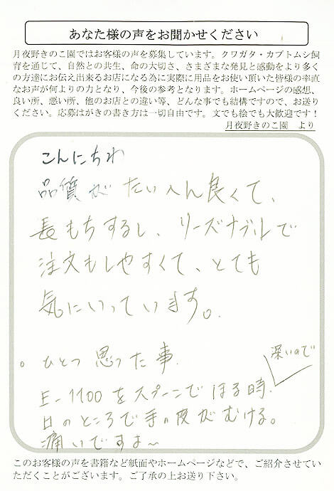 大阪府 杉野 様 E1100 X Facebook はてブ LINE Pinterest コピー 2011.08.27 こんにちわ 品質がたいへん良くて、長もちするし、 リーズナブルで注文もしやすくて、 とても気にいっています。 ○ひとつ思った事、 E-1100をスプーンでほる時(深いので) 口のところで手の皮がむける。 痛いですよ~