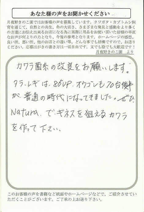 大阪府 武田 様 40代 X Facebook はてブ LINE Pinterest コピー 2013.11.27 カワラ菌糸の改良をお願いします。 タラ、レギは、86UP、オウゴンも70台後半 が普通の時代になってきました。ぜひ、 Naturaでギネスを狙えるカワラ を作って下さい。