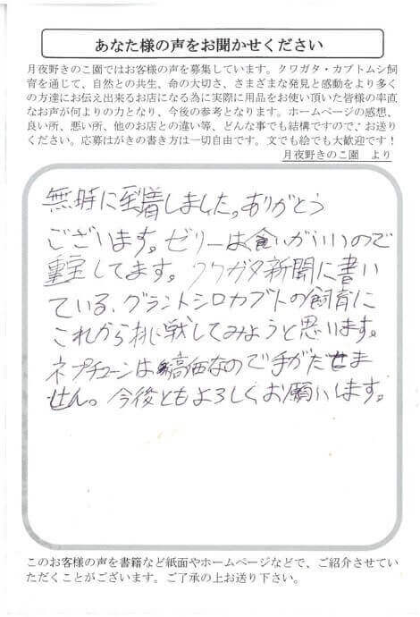 大阪府 藤堂 様 50代 X Facebook はてブ LINE Pinterest コピー 2017.10.11 無事に到着しました。ありがとうございます。ゼリーは食いがいいので重宝してます。クワガタ新聞に書いているグラントシロカブトの飼育にこれから挑戦してみようと思います。ネプチューンは高価なので手がだせません。今後ともよろしくお願いします。