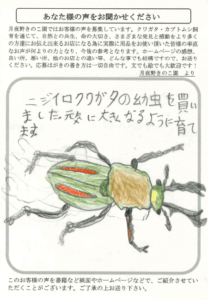 菌糸ビンを注文させていただきましたが、品質が非常に良く他のメーカーと比較してもいいので今後も利用させていただきたいです。オオクワガタの生体も非常にきれいな形で満足させていただきました。今後ともよろしくお願いします。