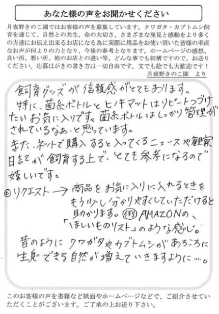 飼育グッズが信頼感がとてもあります。特に、菌糸ボトルとヒノキマットはリピーターつづけたいお気に入りです。菌糸ボトルはしっかり管理がされているなぁと思います。また、ネットで購入すると入ってくるニュースや観察日記が飼育する上で、とても参考になるので嬉しいです。