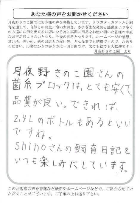 宮崎県 井戸川 様 高品質 X Facebook はてブ LINE Pinterest コピー 2018.03.24 月夜野きのこ園さんの 菌糸ブロックは、とても安くて、 品質が良い。できれば、 2.4Lのボトルもあるといい ですね。 Shihoさんの飼育日記を いつも楽しみにしています。