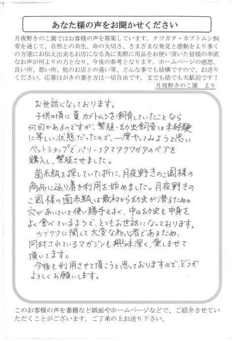 子供の頃に夏カブトムシを飼育していたことなら何回かあるのですが、繁殖・幼虫飼育は未経験に等しい状態だったので、一度やってみようと思いペットショップでパリーフタマタクワガタのペアを購入し、繁殖させました。菌糸瓶を探していた折に、月夜野きのこ園様の商品に辿り着き利用を始めました。月夜野きのこ園様の菌糸瓶は最初から幼虫が潜るための穴があいていて使い勝手もよく、中の幼虫も中身をよく食べているようで、とてもお世話になっております。カブクワに関して大変な初心者であるため、同封されているマガジンも興味深く、楽しませて頂いてます。