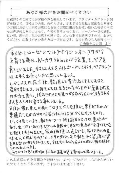 初めてローゼンベルグオウゴンオニクワガタを育てる為に、N-カワラblockバラを買って、ペアを育てていました。オスはメスをメイトガードしており、ペアリングは上手く出来ていたと思っていました。しかしメスの死亡後、数ヶ月して割り出しをしてみると産卵数は0、1ヶ月もメスは生きていなかったので難しかったのかなと思い、代わりのメスも見つからなかったので、残されたオスを大切に育てる事にしました。8月に家に来て、10月にコロリと亡くなるまで、早すぎたのか普通だったにか初心者の私には分からなかったものの、じっくり見ていると、動きの一つ一つその個体にとっては意味があり、虫一匹であってもそこには自我が自分の意志があるのだなと教えてもらいました。命の価値は違えども、命そのものの意味は人と同じなのだと、エサの好み、足に動き、歩く姿、飛ぶ姿を見て学ばせてもらいました。今は先に亡くなったメスと同じ、椿の植木の下にねむっています。ありがとうと思うと同時に、またあの金色の姿を育てたいと思いました。