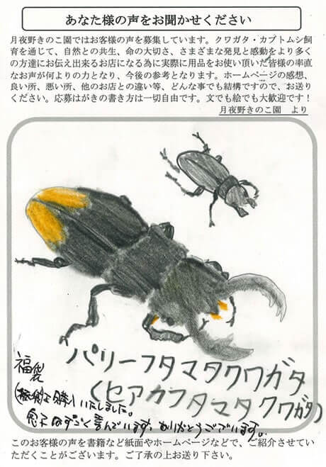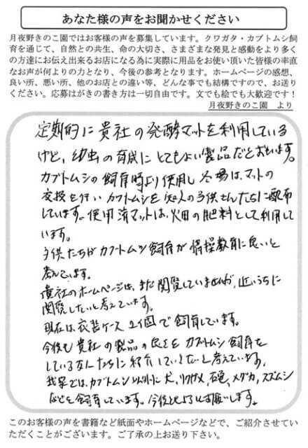 定期的に貴社の発酵マットを利用しているけど、幼虫の育成にとてもよい製品だとおもいます。カブトムシの飼育時より使用し冬場は、マットの交換を行いカブトムシを知人の子供さんたちに配布しています。使用済みマットは畑の肥料として利用しています。子供たちがカブトムシ飼育が情操教育に良いと考えています。貴社のホームページは、まだ閲覧していませんが、近いうちに閲覧したいと考えています。現在は、衣装ケース2個で飼育しています。今後も貴社の製品の良さをカブトムシ飼育をしている友人たちに紹介していきたいと考えています。我家では、カブトムシ以外に犬・リクガメ・石亀・メダカ・スズムシなどを飼育しています。今後ともよろしくお願いします。