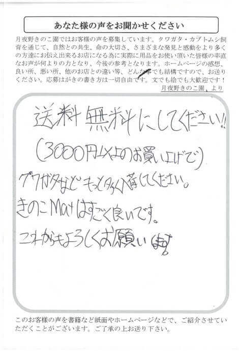 山形県 山田 様 きのこMat X Facebook はてブ LINE Pinterest コピー 2017.09.27 送料無料にしてください(3000円以上のお買い上げで)!! クワガタなどもっと多く入荷してください。 きのこMatはすごく良いです。 これからもよろしくお願いします。