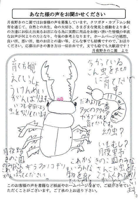 山形県 工藤 様 イラスト X Facebook はてブ LINE Pinterest コピー 2015.12.12 育て方を覚えていっしょうけんめいがんばります。 いつも安全によう虫をかんりしています。 月夜野きのこ園のみなさんもがんばってください。 今かっているこん虫を大切に育てたいです。 だれよりも一番おおくのクワガタやカブト虫を育てたいです。 これからもいろんな物を育てたいです。 月夜野きのこ園のみなさんこん虫をたくさんくれてありがとうございます。