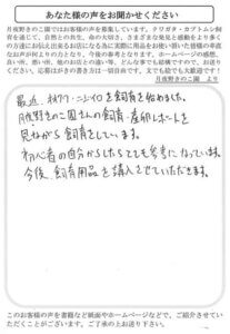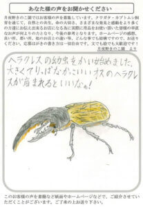 まずは、この様な形で”声”を大切にしている事に好感が持てます。益々の繁栄をお祈り申し上げます。今回、初めて「きのこMat」を購入させて頂きました。オオクワとカブトの幼虫用です。今までオオクワには菌糸のみでしたが、今回は「きのこMat」を使用してみます。ちなみにカブトは、今回が初めてなので楽しみです。結果はどうであれ同封されているチラシや、詳しい説明書もあり、貴社の想いが伝わりました。