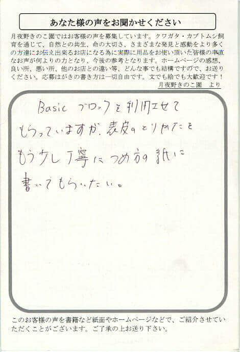 山梨県 望月 様 Basic X Facebook はてブ LINE Pinterest コピー 2011.03.23 Basicブロックを利用させてまらっていますが、 表皮のとりかたをもう少し丁寧に つめ方の紙に書いてもらいたい。