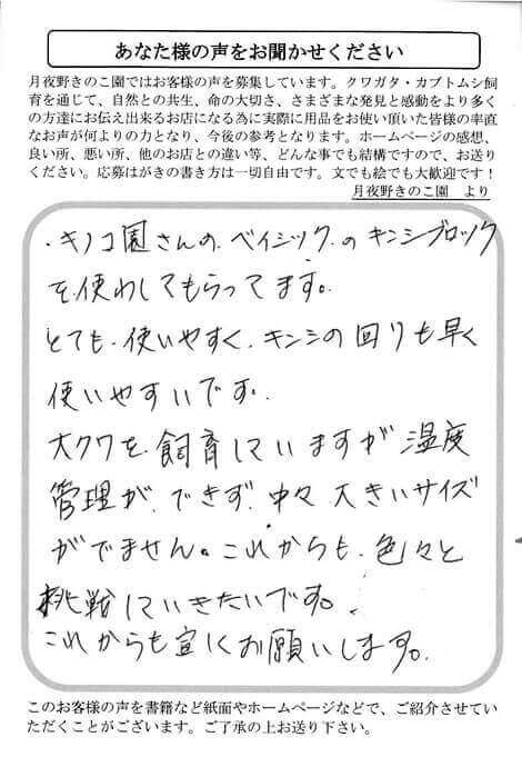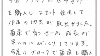 岐阜県 古田 様 Basic X Facebook はてブ LINE Pinterest コピー 2016.03.18 キノコ園さんのベイシックのキンシブロック を使わしてもらってます。 とても使いやすく、キンシの回りも早く 使いやすいです。 大クワを、飼育していますが温度 管理が、できず、中々大きいサイズ がでません。これからも、色々と 挑戦していきたいです。 これからも宜しくお願いします。