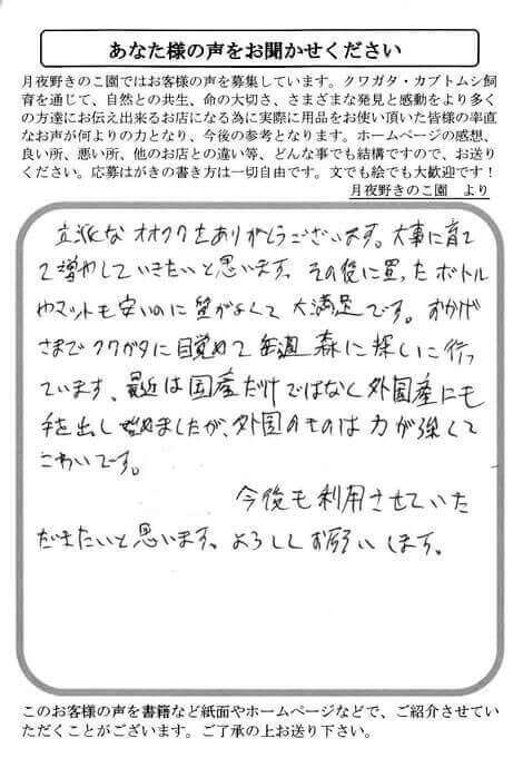 岐阜県 瀬川 様 生体 X Facebook はてブ LINE Pinterest コピー 2015.07.14 立派なオオクワをありがとうございます。大事に育て て増やしていきたいと思います。その後に買ったボトル やマットも安いのに質が良くて大満足です。おかげ さまでクワガタに目覚めて毎週森に探しに行っ ています。最近は国産だけではなく外国産にも 手を出し始めましたが、外国のものは力が強くて こわいです。今後も利用させていた だきたいと思います。よろしくお願いします。