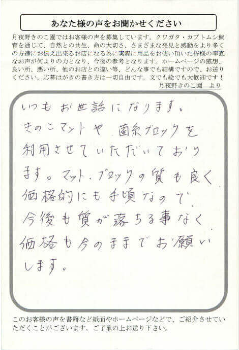 岐阜県 田部 様 低価格 X Facebook はてブ LINE Pinterest コピー 2011.04.12 いつもお世話になります。 きのこマットや、菌糸ブロックを 利用させていただいております。 マット、ブロックの質も良く 価格的にも手頃なので 今後も質が落ちる事なく 価格も今のままでお願いします。