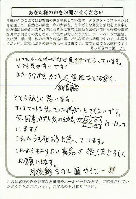 岩手県 長澤 様 きのこMat X Facebook はてブ LINE Pinterest コピー 2014.01.07 いつもホームページなど見させてもらっています。 とても見やすいです! また、クワガタ、カブト飼育用品の値段なども安く、 とてもうれしく思います。 キノコマットも使っていますが、とてもよいです。 今、国産カブト虫の幼虫が32gになって います! これからも使おうと思っています。 これからもよりよい商品の提供よろしく お願いします。 月夜野きのこ園サイコー!!