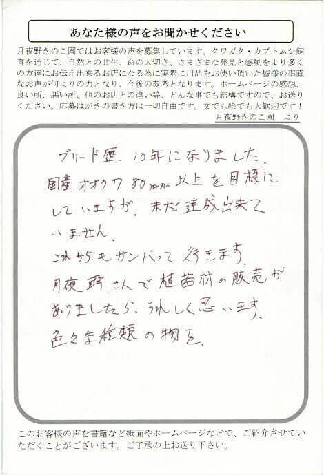 島根県 布野 様 2011 3/09 その他 30代 2011年3月9日 ブリード歴 10年になりました。 国産オオクワ80mm以上を目標に していますが、未だ達成できていません。 これからもガンバッテいきます。 月夜野さんで植菌材の販売が ありましたら、嬉しく思います。 色々な種類に物を。 その他 30代 よかったらシェアしてね! URLをコピーしました! URLをコピーしました! 神奈川県 佐野 様 滋賀県 田中 様 おすすめ記事 てすと投稿です。 2025年12月23日 東京都 澤井 様 2025年12月17日 千葉県 平野 様 2025年12月15日 群馬県 はやしかわ 様 2025年11月21日 群馬県 はやしかわ 様 2025年11月21日 奈良県 栗原 様 2025年11月21日 群馬県 鈴木 様 2025年11月21日 大阪府 ささべ 様 2025年11月21日