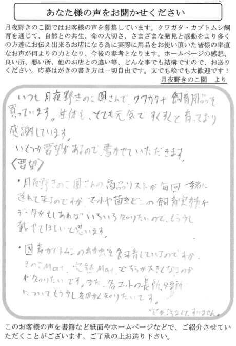 島根県 森口 様 飼育用品 X Facebook はてブ LINE Pinterest コピー 2020.09.162025.12.17 いつも月夜野きのこ園さんで、クワガタや飼育用品を買っています。生体も、とても元気ですくすく育っており感謝しています。・・・・・