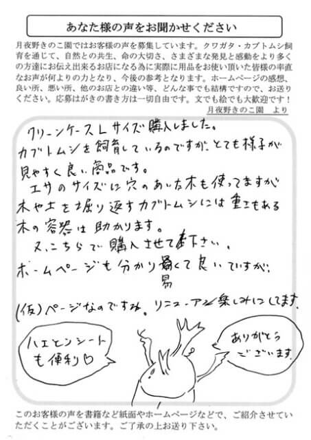 クリーンケースLサイズ購入しました。カブトムシを飼育しているのですが、とても様子が見やすく良い商品です。エサのサイズに穴のあいた木も使ってますが、木や土を掘り返すカブトムシには重さもある木の容器は助かります。又、こちらで購入させて下さい。ホームページも分かり易くて良いですが、(仮)ページなのですね。リニューアル楽しみにしてます。